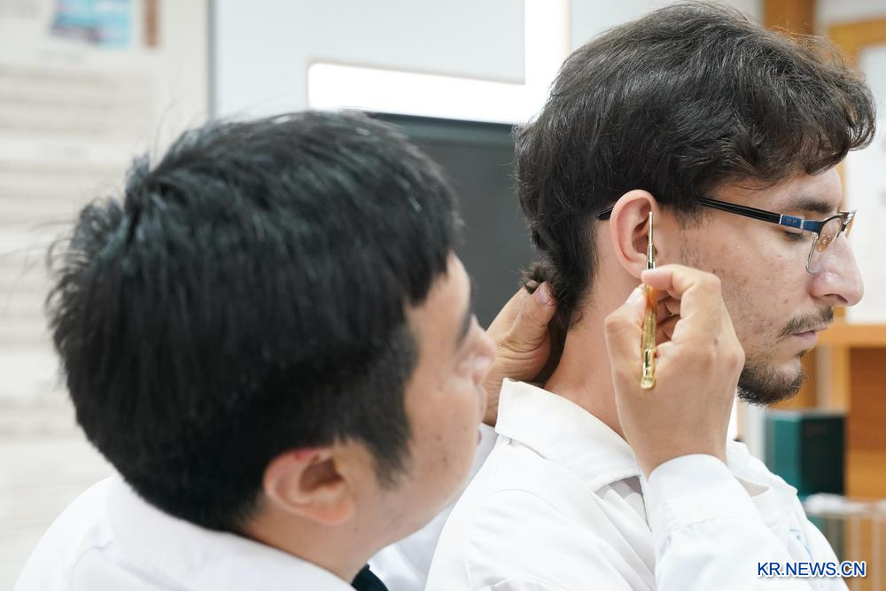 안후이(安徽)중의약대학 교수(왼쪽)가 지난 16일 외국 학생에게 혈 자리를 알려주고 있다.