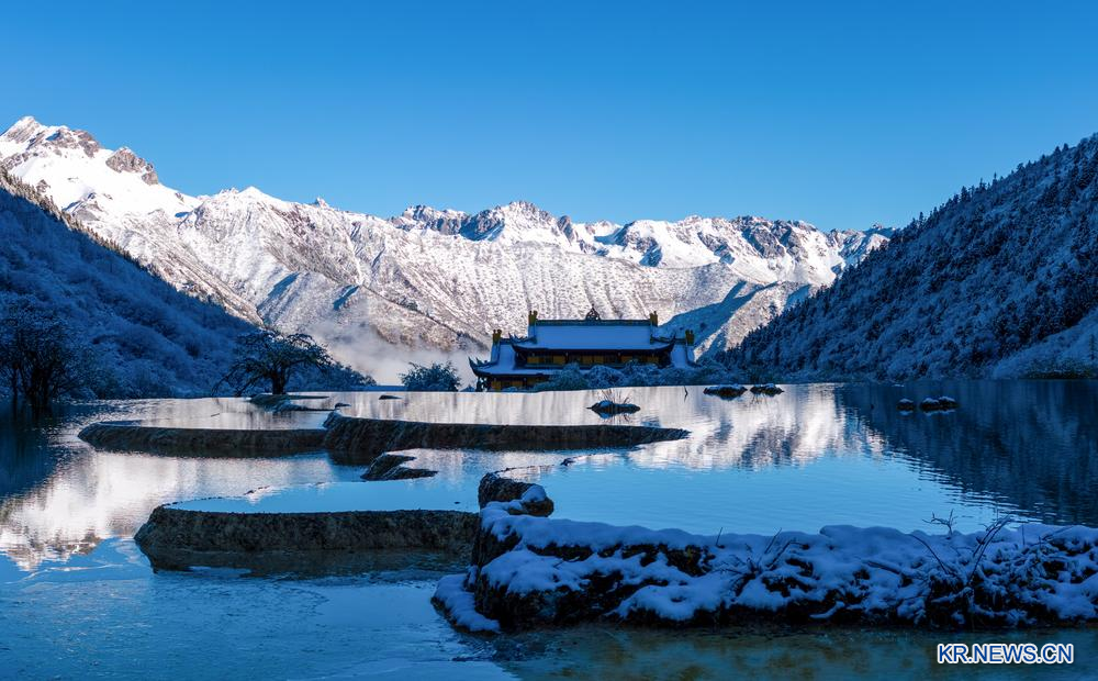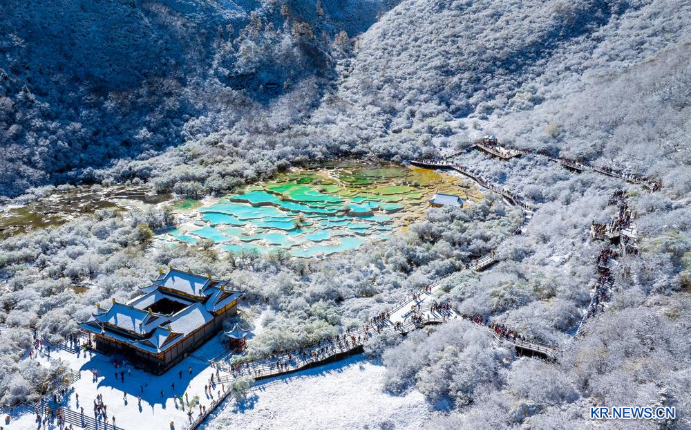 21일 쓰촨(四川)성 아바(阿壩) 짱족(藏族)창족(羌族)자치주에 위치한 황룽(黃龍)관광지에 첫눈이 내려 우차이츠(五彩池)와 새하얀 설경이 어우러지며 한 폭의 아름다운 풍경을 자아냈다.