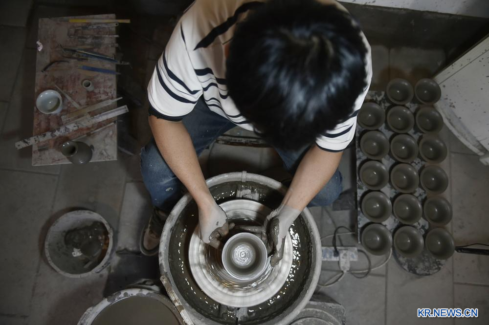 22일 직원이 허난(河南)성 루저우(汝州·여주)의 한 여요(汝窯) 생산 기업 공방에서 도자기를 만들고 있다. 여요 예술의 중요 발원지인 루저우시는 최근 수년간 여요 산업의 전승과 발전을 추진했다. 루저우시의 여요 생산·판매 기업은 400여 개, 종사자 수는 5천여 명에 달한다. 2025.10.23