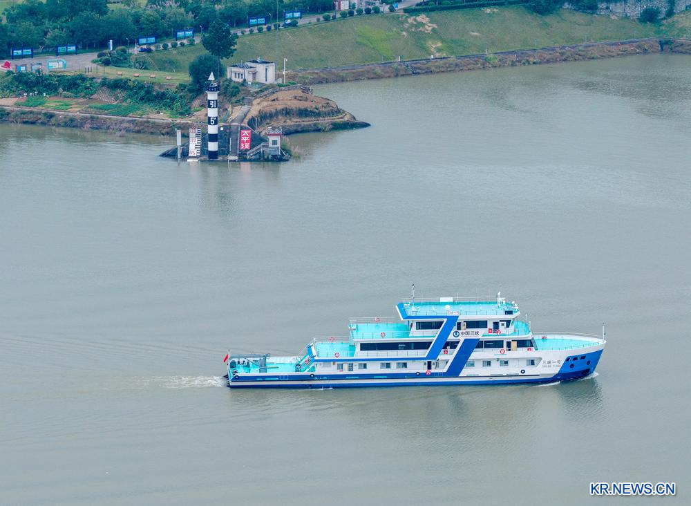 24일 후베이(湖北)성 이창(宜昌)시 타이핑시(太平溪) 수역에서 수문 수위표 앞을 지나는 선박을 드론으로 촬영했다.