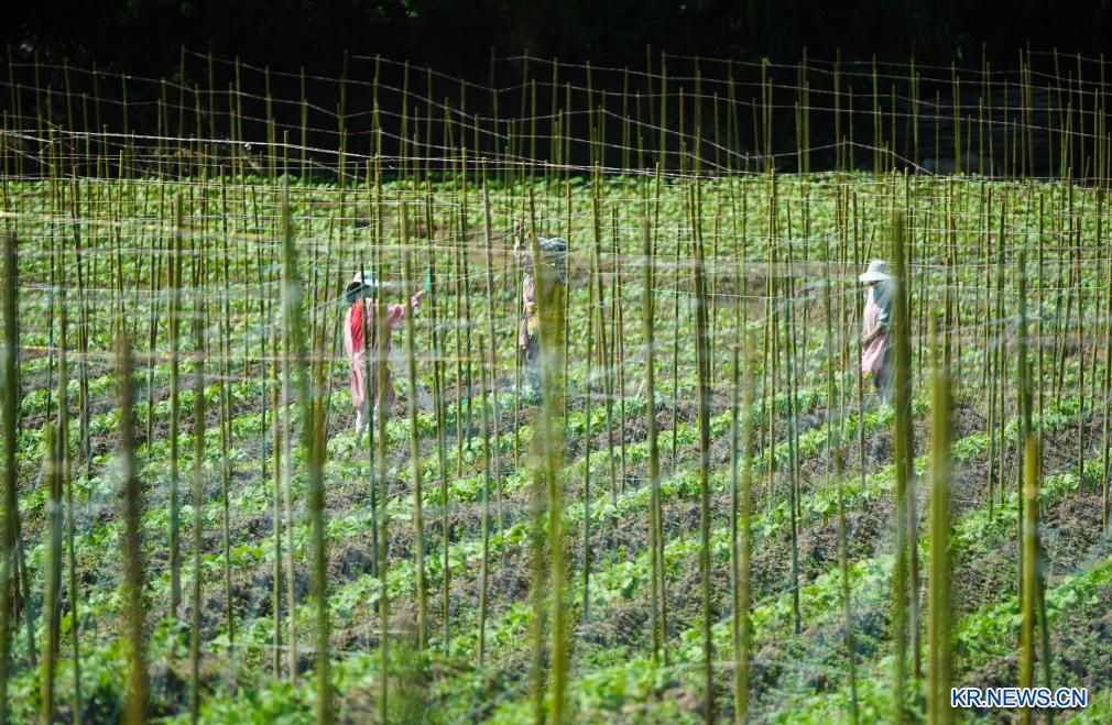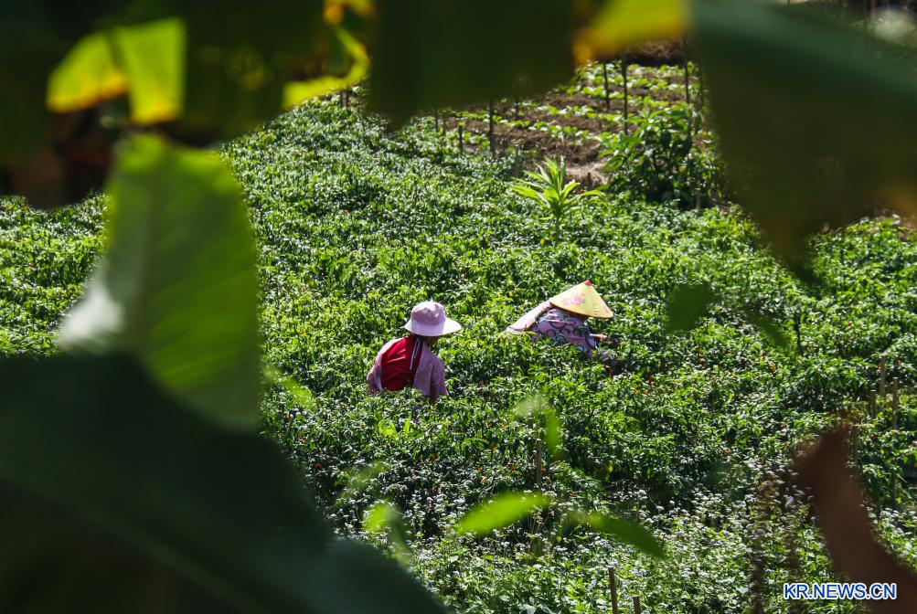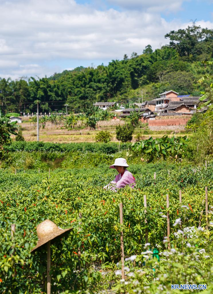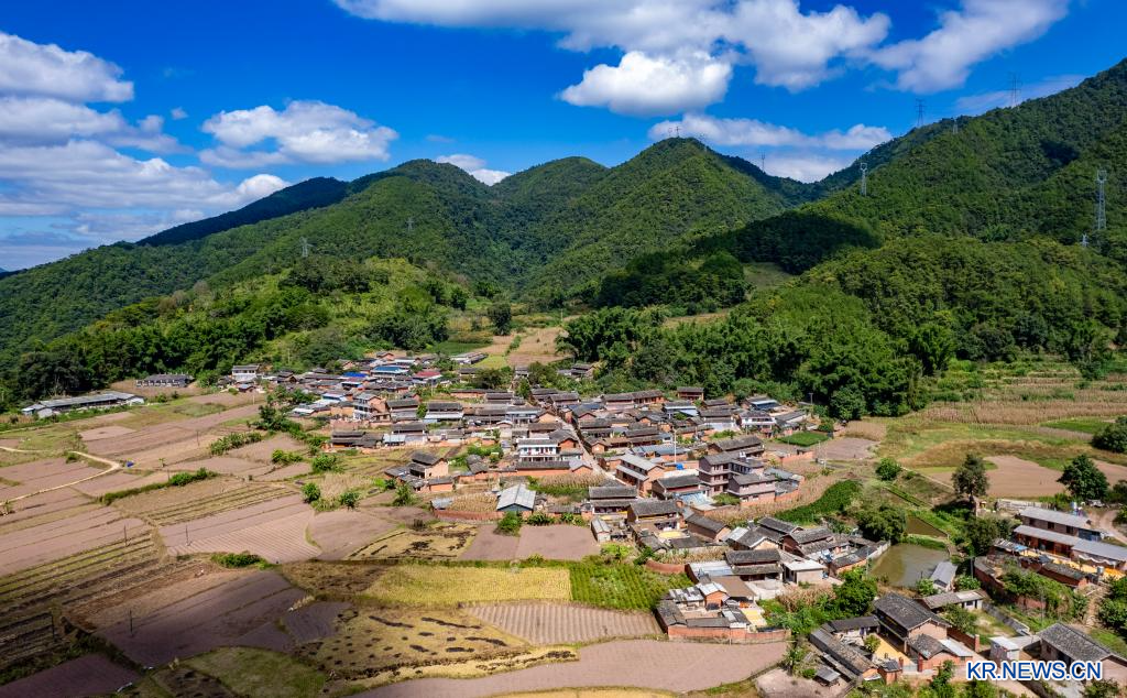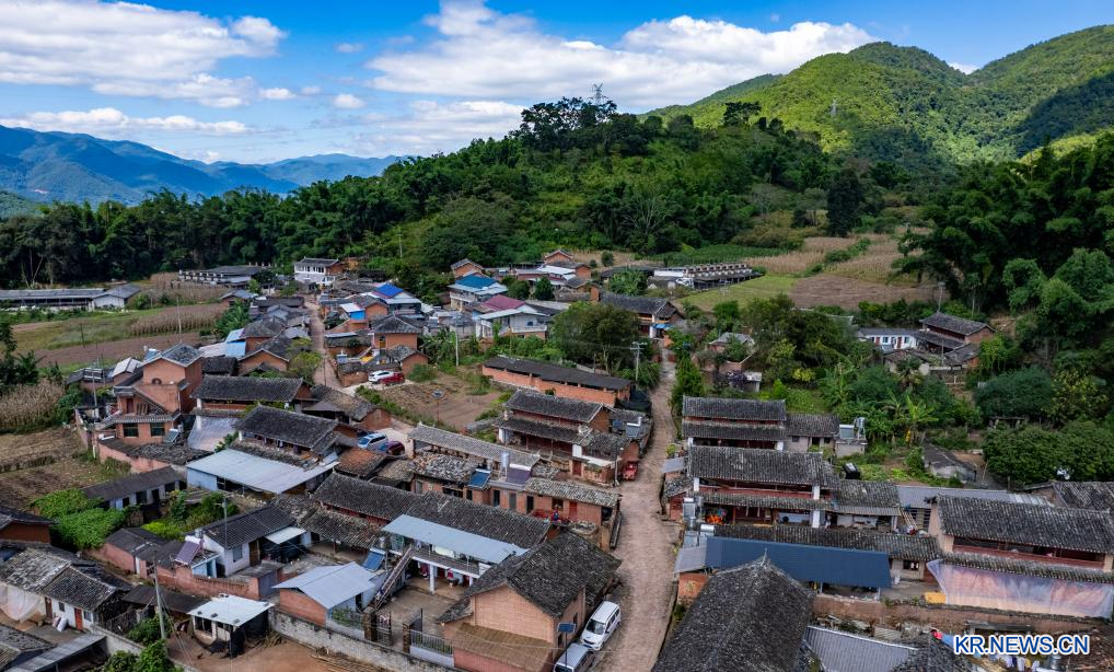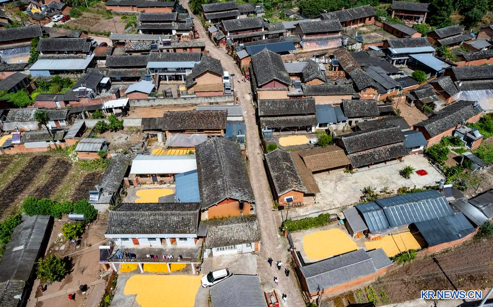 [신화망 쿤밍 10월27일] 23일 여행객들이 윈난(雲南)성 푸얼(普洱)시 쿵췌핑(孔雀屏)촌의 청석 돌길을 거닐고 있는 모습을 드론으로 담았다.