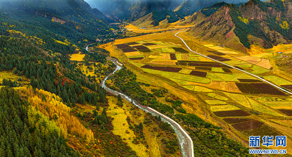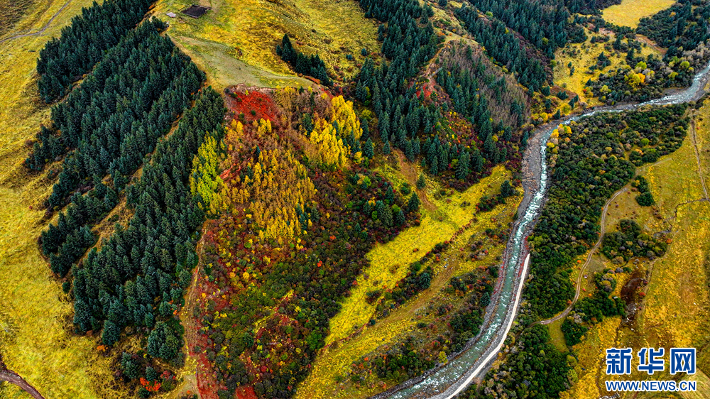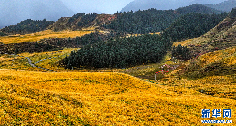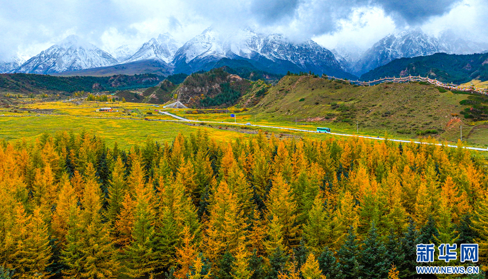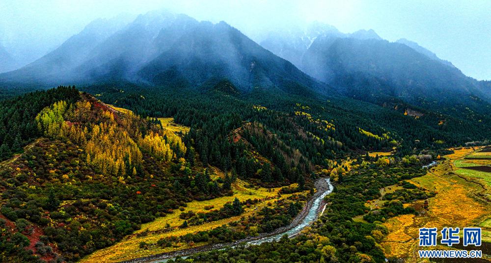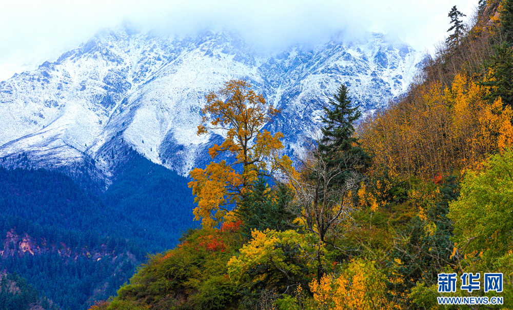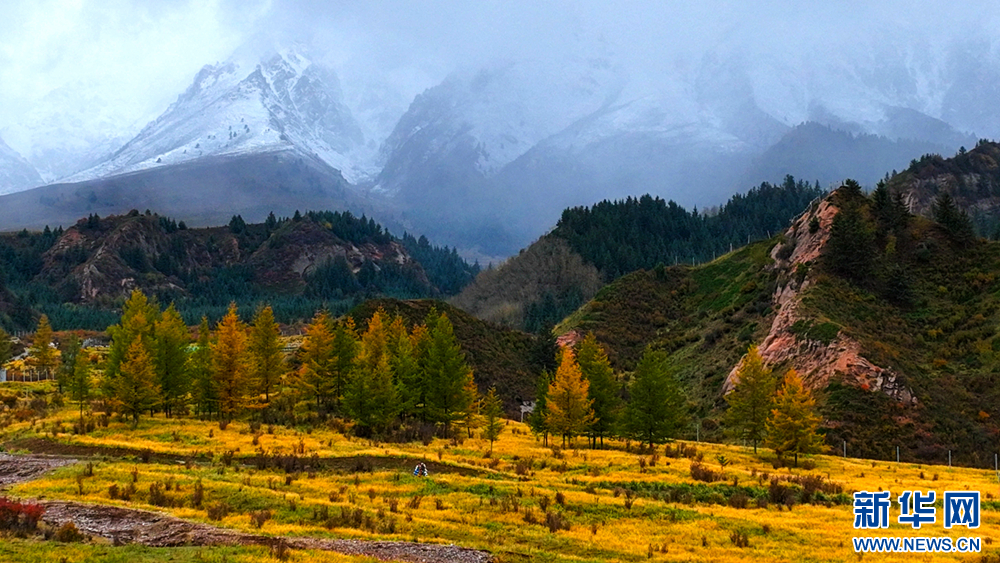 [신화망 베이징 10월29일] 치롄산 국립공원 간쑤(甘肅)성 장예(張掖)시 쑤난위구족자치현 마티(馬蹄)향 구간은 산꼭대기에 흰 눈이 하얗게 쌓여 있고 산속에는 운무가 자욱하다. 나무들이 가을빛으로 물들어 형형색색의 늦가을 풍경을 선사하고 있다.