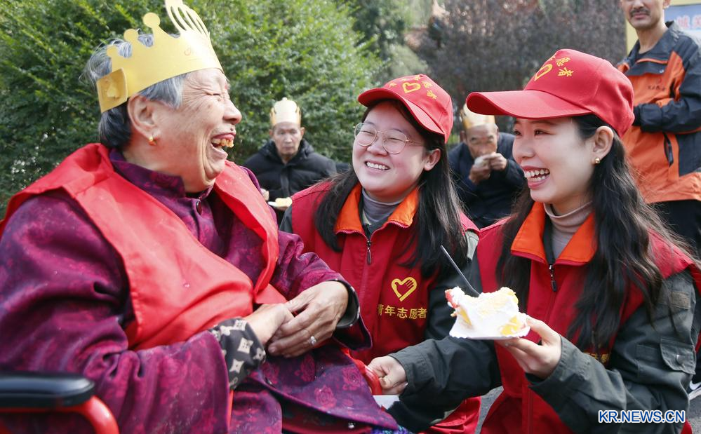 28일 허난(河南)성 뤄양(洛陽)시의 한 양로원에서 청년 자원봉사자들이 노인에게 케이크를 전달하고 있다.