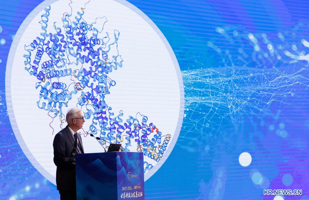 27일 베이징에서 열린 '2025 세계 과학기술 및 발전 포럼' 개막식에서 니컬러스 더크스 미국 뉴욕과학아카데미 사장 겸 최고경영자가 기조연설을 하고 있다.
