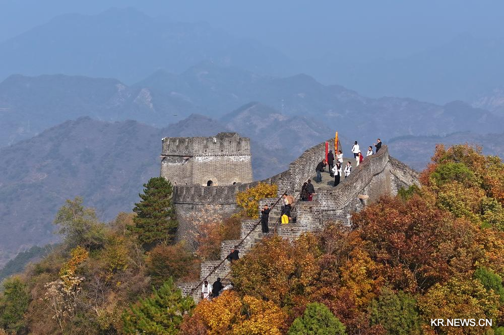 [신화망 톈진 10월30일] 28일 톈진(天津)시 지저우(薊州)구 황야관(黃崖關) 만리장성의 가을 풍경을 드론으로 담았다.