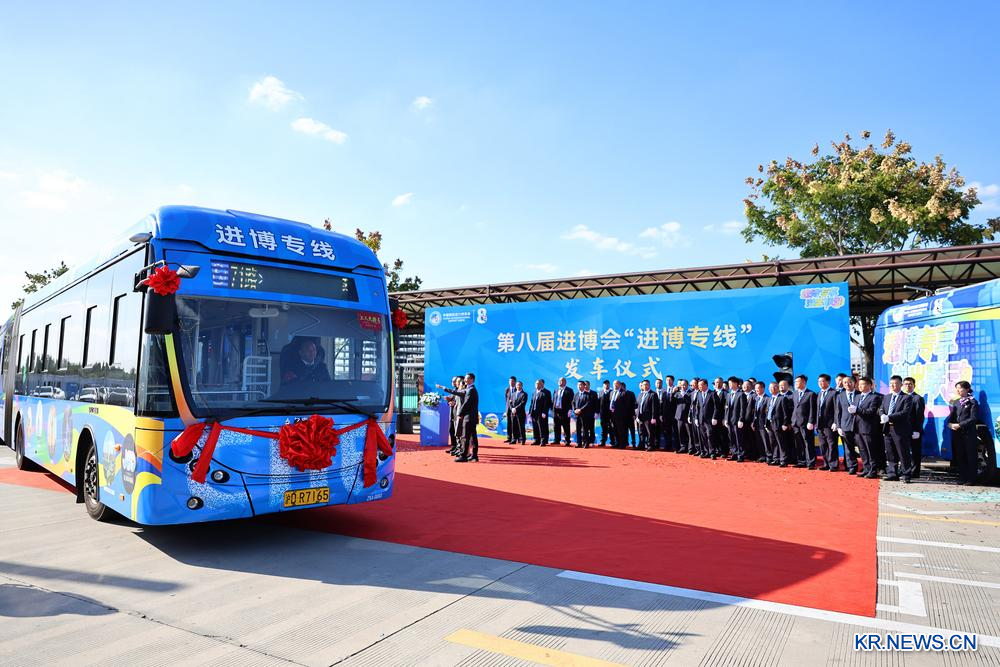 29일 발차식 현장에 전시된 중국국제수입박람회(CIIE) 전용 셔틀버스.