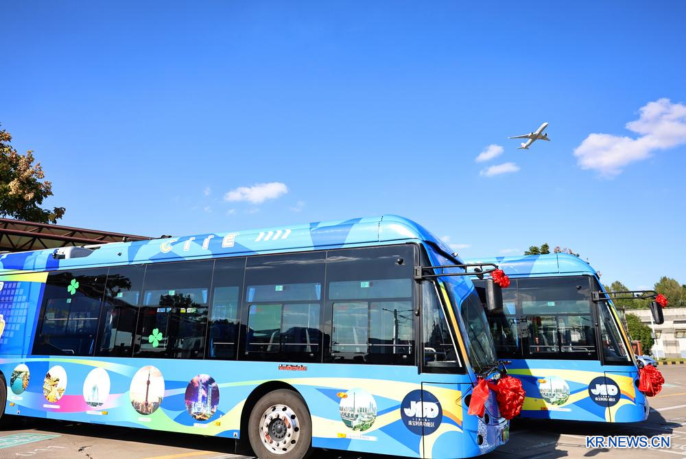 [신화망 상하이 10월30일] '제8회 중국국제수입박람회(CIIE)' 전용 셔틀버스 발차식이 29일 상하이에서 열렸다. 이번에 운행에 투입된 8대의 셔틀버스는 블루를 메인 색상으로 한 세련된 디자인으로 눈길을 끌었다. 버스는 와이탄(外灘)과 상하이 국가컨벤션센터를 오가며 전시 참가자와 관람객의 이동 편의를 높이는 한편, 화이하이루(淮海路), 징안쓰(靜安寺), 쉬자후이(徐家匯), 베이와이탄(北外灘) 등 상하이 도심의 주요 상권을 연결해 운행된다. CIIE 전용 셔틀버스는 11월 1일부터 30일까지 한 달간 상시 운영될 예정이다
