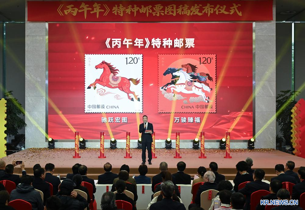 중국우정그룹이 29일 베이징에서 '병오년' 특별우표 도안 발표 행사를 열었다. 병오년 말띠 우표 도안은 처음으로 국민 공모를 통해 선정했다. 특별우표 세트는 내년 1월 5일 정식 발매될 예정이다.