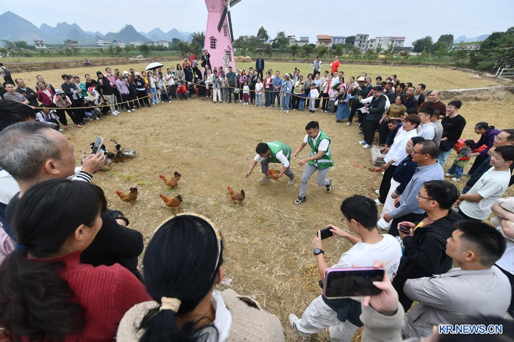 [신화망 류저우 11월2일] 1일 광시(廣西)좡족자치구 류저우(柳州)시 류장(柳江)구에서 민족 가무 공연, 농특산물 판매, 농경 문화 체험 등을 통해 수확의 기쁨을 나누는 풍년 축하 행사가 열렸다.