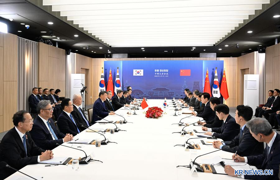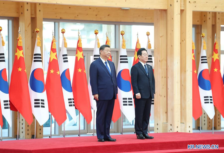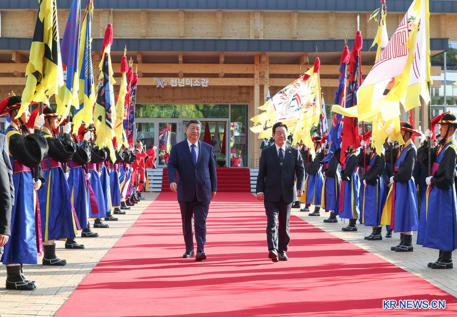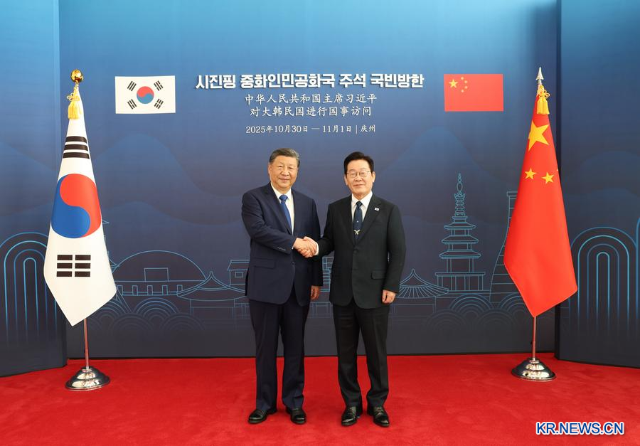 [신화망 경주 11월2일] 이재명 한국 대통령이 1일 오후 경주에서 국빈 방문한 시진핑(習近平) 중국 국가주석을 위해 성대한 환영식을 열었다.