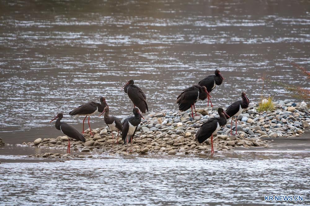 [신화망 루훠 11월4일] 최근 먹황새 무리가 쓰촨(四川)성 루훠(爐霍)현 셴수이허(鮮水河) 국가습지공원을 찾아 서식하면서 아름다운 풍경을 연출하고 있다.