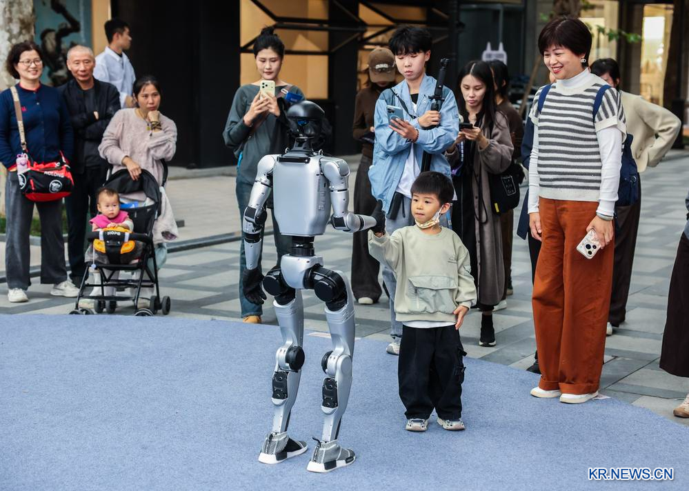 이날 푸위안 패션 고진에서 휴머노이드 로봇과 상호작용하는 관광객. 2025.11.5