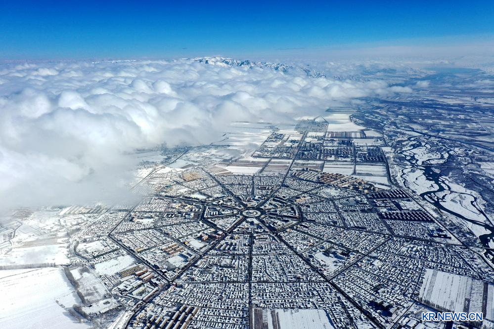 6일 눈으로 덮인 신장(新疆) 터커쓰(特克斯)현을 드론으로 내려다봤다. 2025.11.6