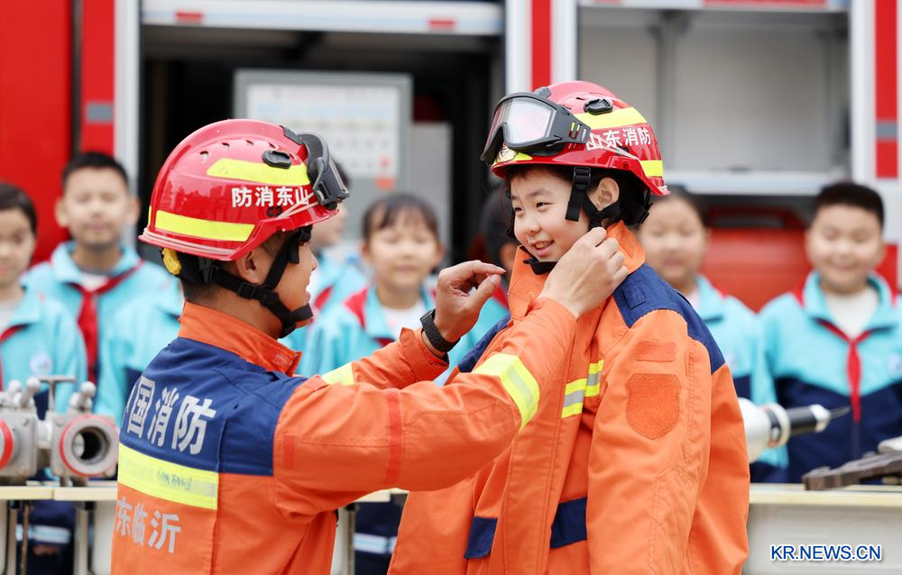 [신화망 베이징 11월8일] 7일 산둥(山東)성 린이(臨沂)시 탄청(郯城)현의 한 학교에서 소방관 보호 장비를 체험하는 초등학생.