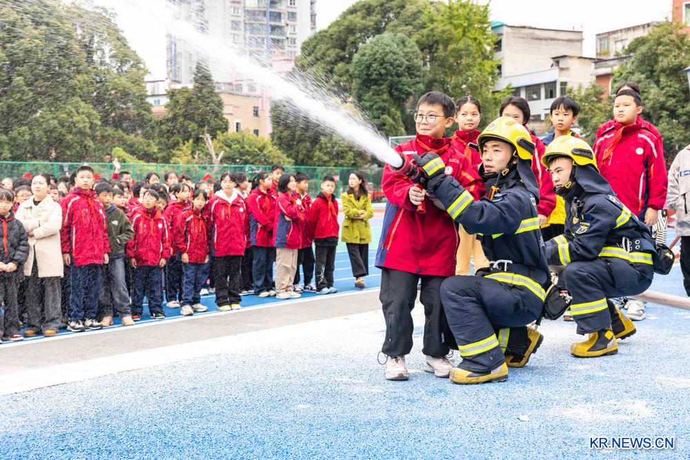 구이저우(貴州)성 안순(安順) 경제기술개발구 소방관이 7일 학생들에게 소방호스 사용법을 알려주고 있다. 2025.11.7