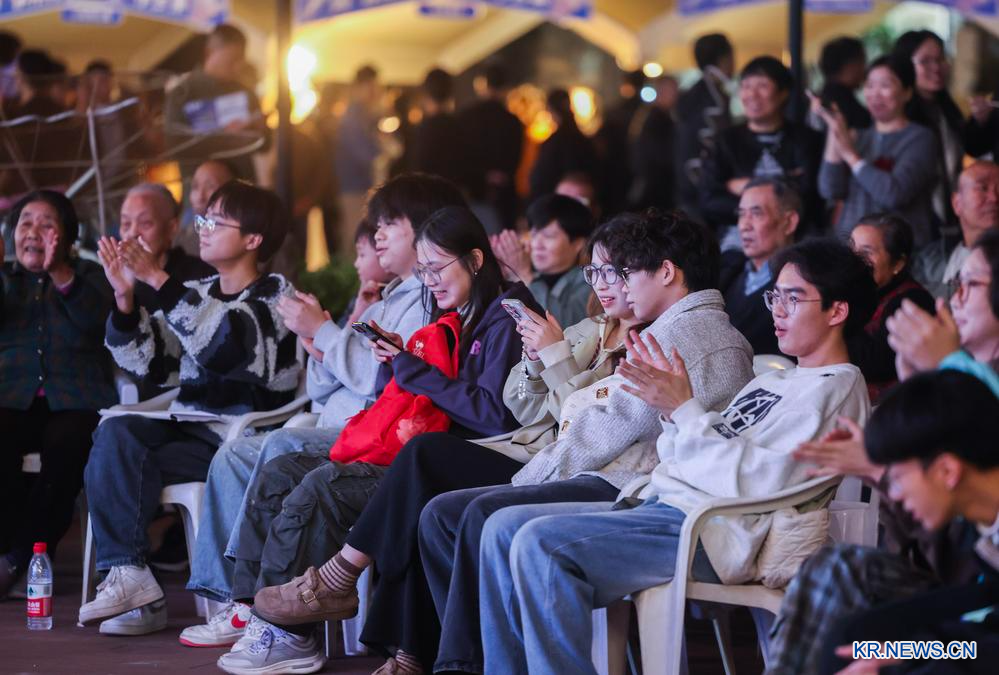 주지시 시민과 관광객이 7일 타오주가도 공동부유 플리마켓에서 열린 공연을 관람하고 있다. 2025.11.8