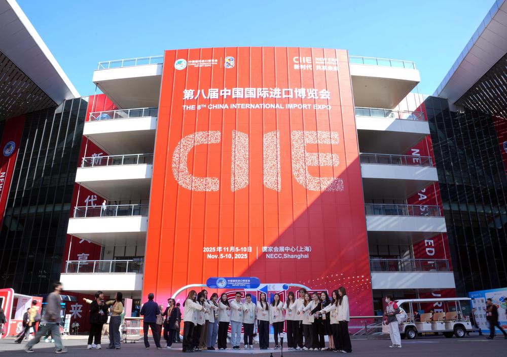 이날 CIIE 대형 로고 앞에서 기념사진을 찍는 사람들. 2025.11.10