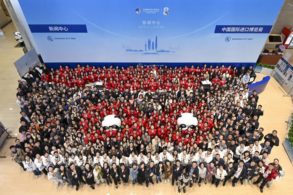 10일 '제8회 중국국제수입박람회(CIIE)' 프레스센터에서 자원봉사자 및 직원들이 단체사진을 찍고 있다.