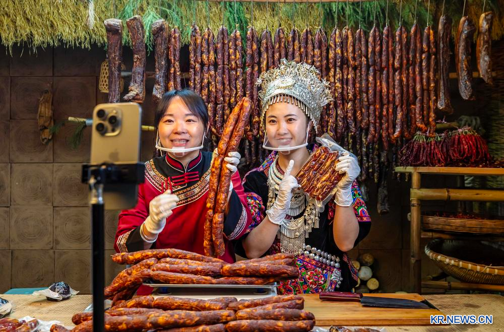 11일 구이저우(貴州)성 첸시(黔西)시 전자비즈니스서비스센터 전자상거래 플랫폼에서 직원들이 라이브커머스로 농특산품을 판매하고 있다.