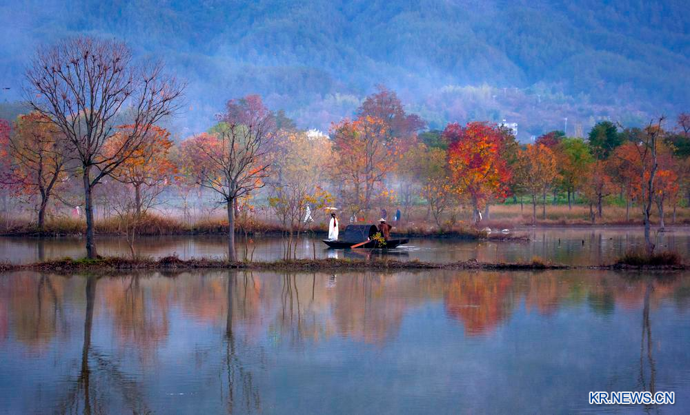 12일 여행객이 후베이(湖北)성 황강(黃岡)시 허시판(河西畈)촌에서 작은 목선을 타고 단풍을 감상하고 있다.