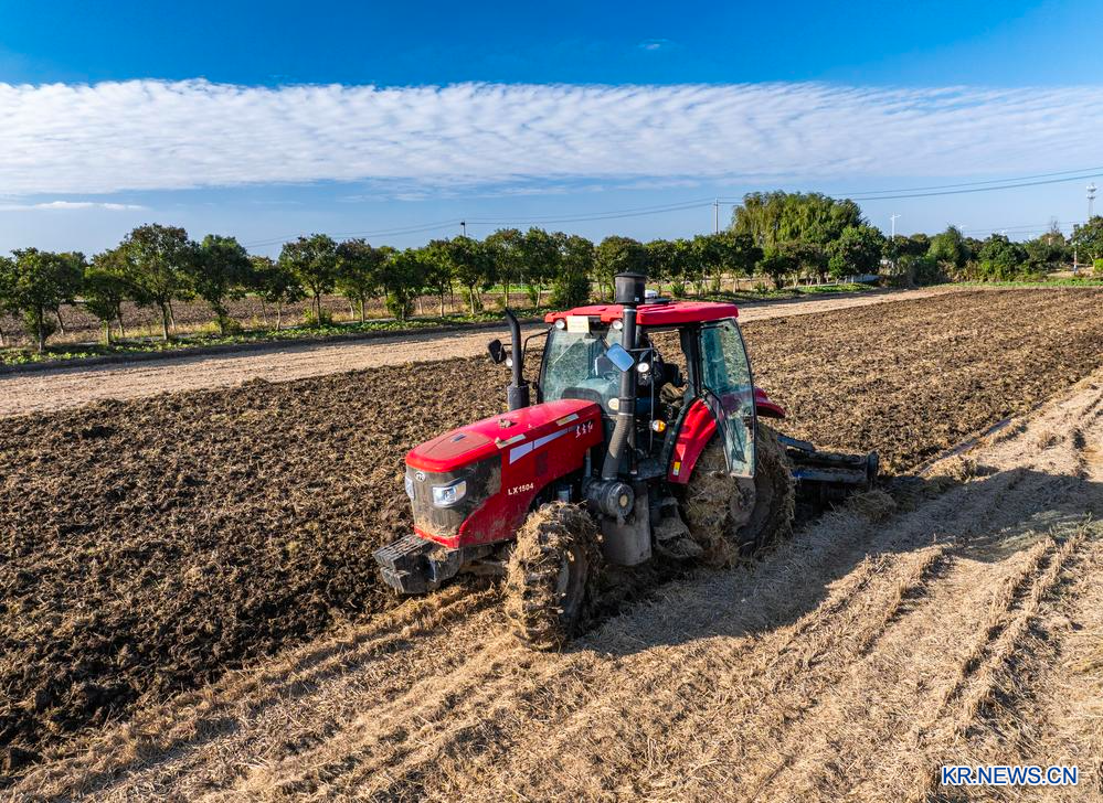 11일 겨울 밀 파종을 준비하는 장쑤(江蘇)성 싱화(興化)시 농민을 드론으로 담았다.