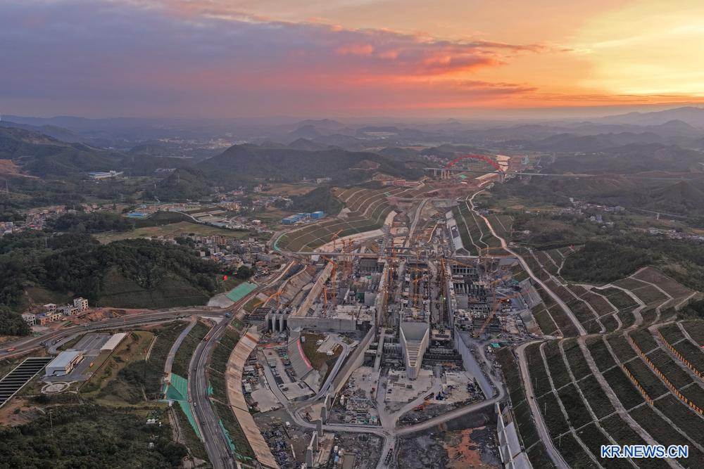 11일 드론으로 내려다본 광시(廣西)좡족자치구 핑루운하 마다오(馬道)허브 공사 현장. 2025.11.11