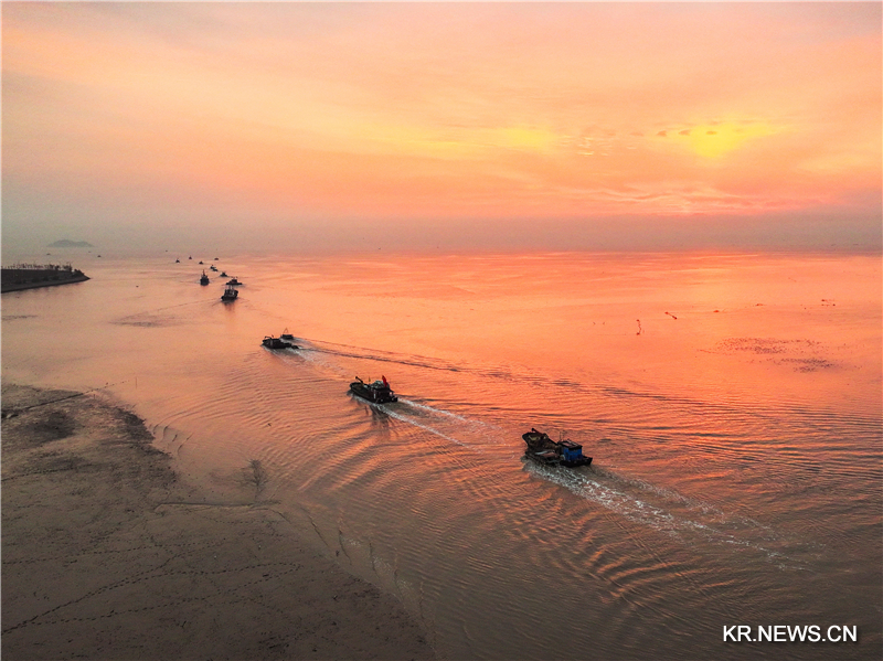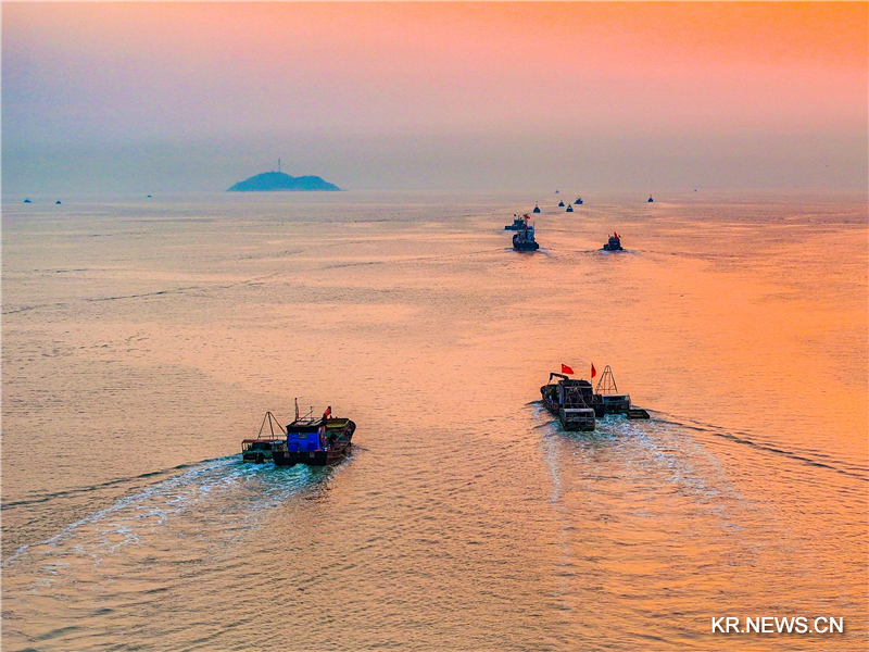 [신화망 베이징 11월15일] 최근 조업철을 맞아 장쑤성 롄윈강시 간위(赣榆)구 어민들이 아침노을을 맞으며 어선을 타고 출항해 조업을 하느라 분주한 나날을 보내고 있다.