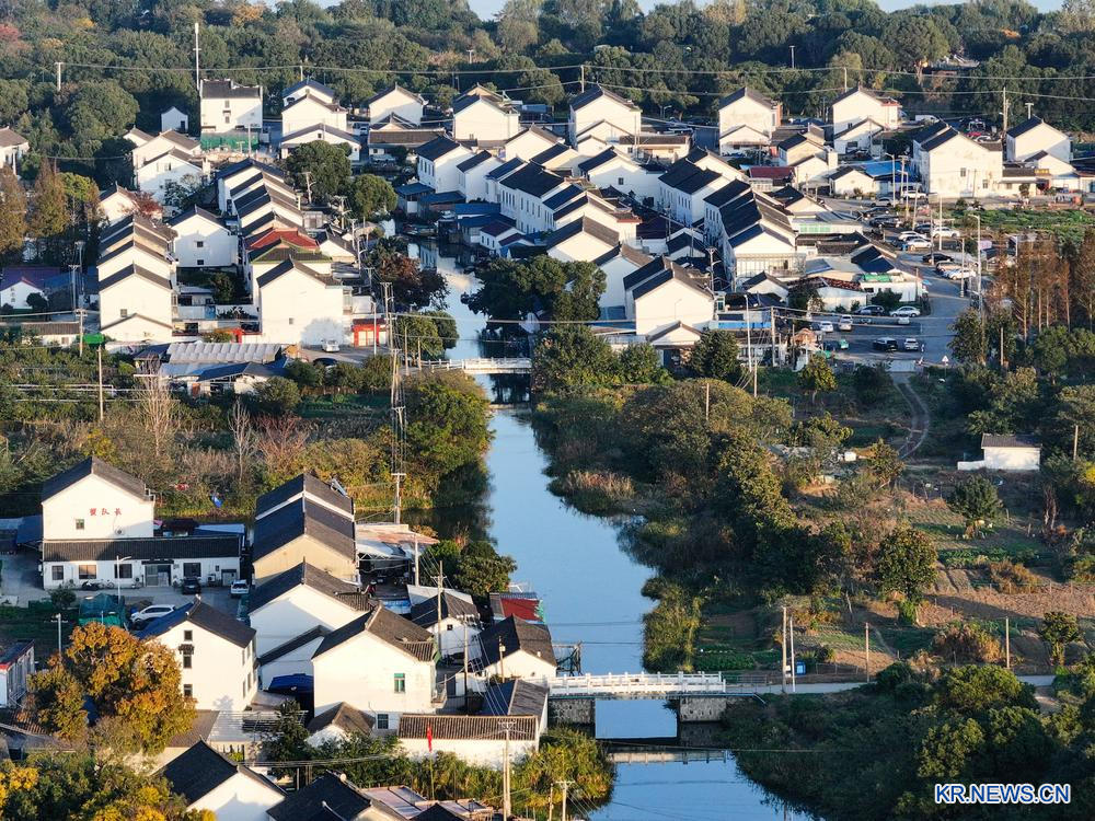 [신화망 쑤저우 11월15일] 초겨울 장쑤(江蘇)성 쑤저우(蘇州)시 샹청(相城)구 양청후(陽澄湖)의 '메이런투이(美人腿)' 반도에선 흰 벽과 검은 기와로 지어진 전통 가옥이 논과 호수와 어우러져 아름다운 수향마을의 풍경을 자아낸다.