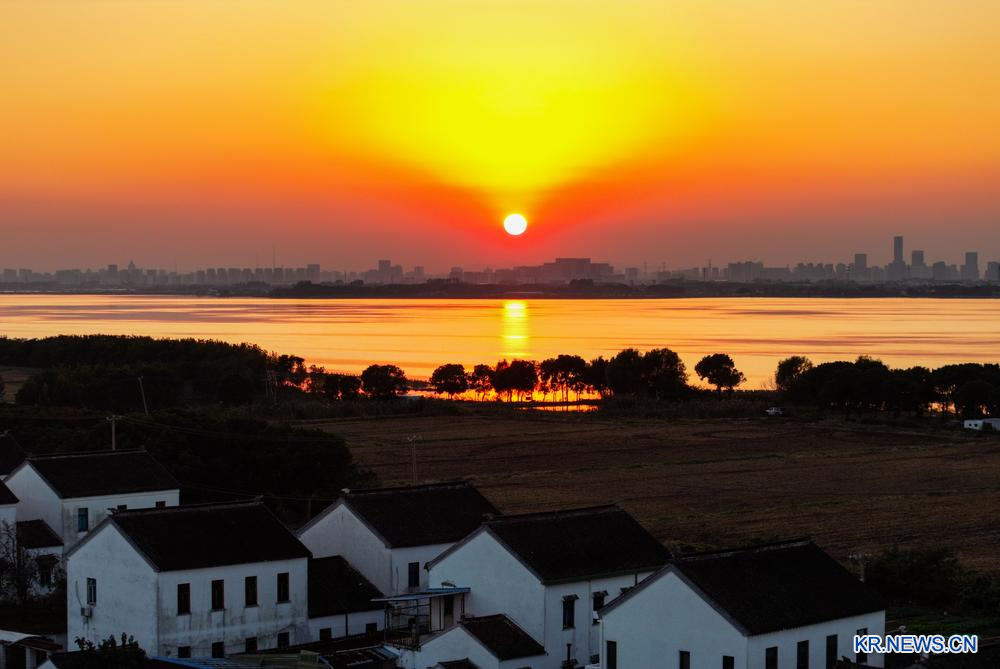 13일 해질녘 장쑤(江蘇)성 쑤저우(蘇州)시 샹청(相城)구 양청후(陽澄湖)의 풍경을 드론으로 내려다봤다.
