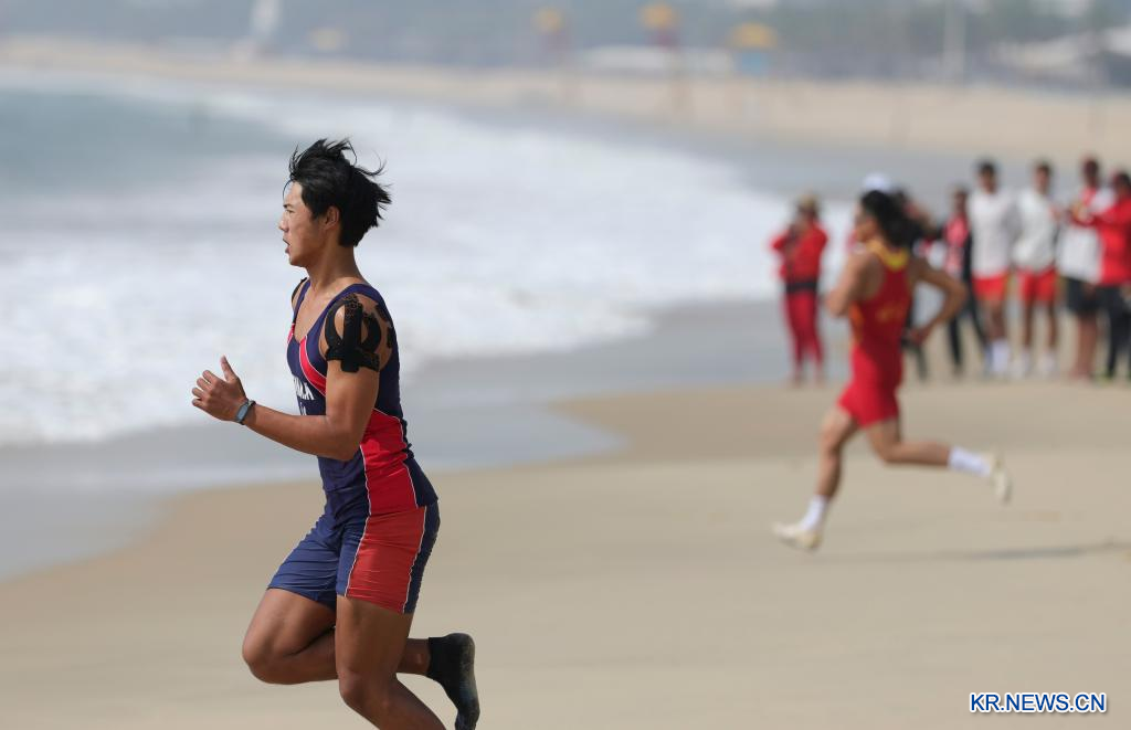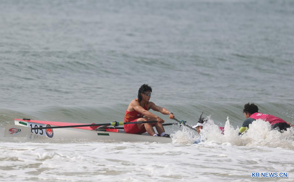 15일 광둥성 양장시에서 열린 제15회 전국운동회 비치조정 남자 싱글스컬 결승 A에서 탄루카이(푸젠팀)가 룽전타오(쓰촨팀)를 꺾고 금메달을 땄다. [촬영/신화사 기자 리란(李然)]pagebreak