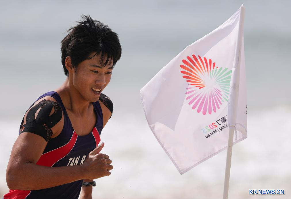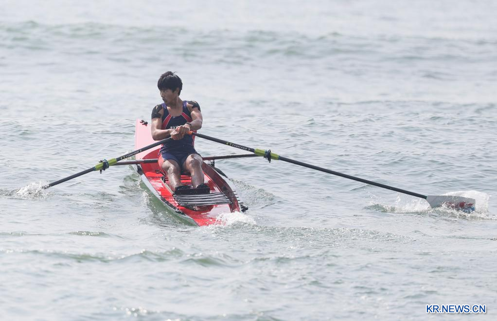 [신화망 양장 11월18일] 17일 광둥성 양장시에서 열린 제15회 전국운동회 비치조정 남자 싱글스컬 결승 A에서 탄루카이(푸젠팀)가 룽전타오(쓰촨팀)를 꺾고 금메달을 땄다. [촬영/신화사 기자 리란(李然)]