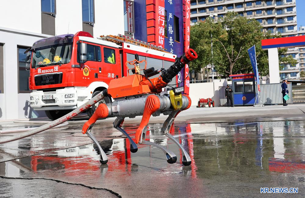 [신화망 상하이 11월19일] 중국 소방 홍보의 달 행사가 18일 상하이시 창닝(長寧)구에서 열렸다. 소방 안전 테마 버스, 소방 드론 등 새로운 소방 구조 장비가 행사 현장에 등장했다.