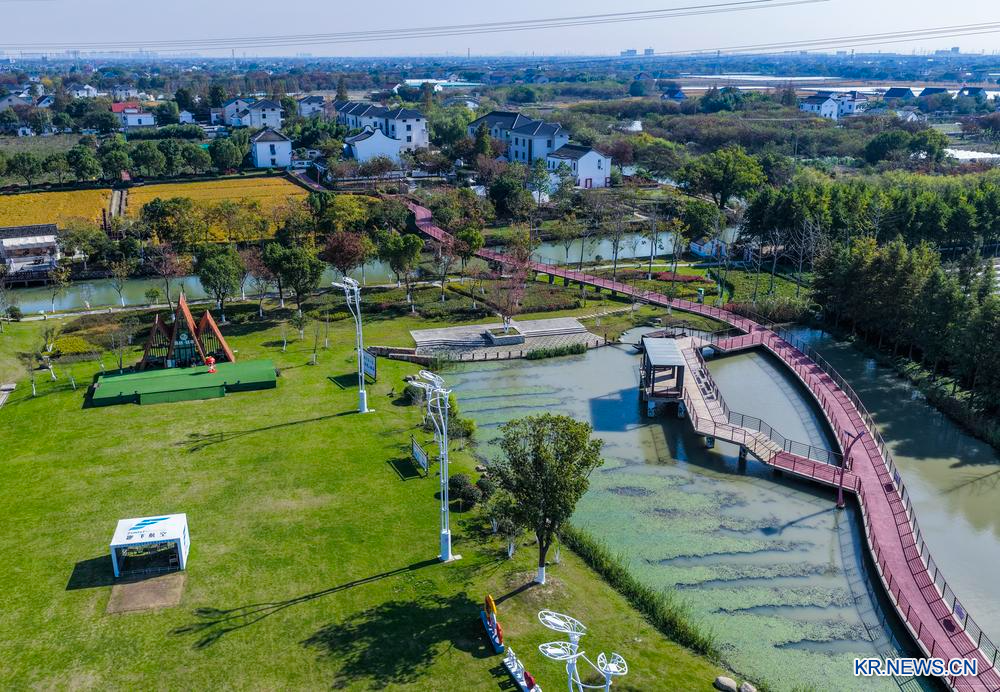 18일 자싱시 난후(南湖)구 롄펑(聯豐)촌의 그린웨이와 마을 관광지를 드론으로 내려다봤다. 2025.11.18
