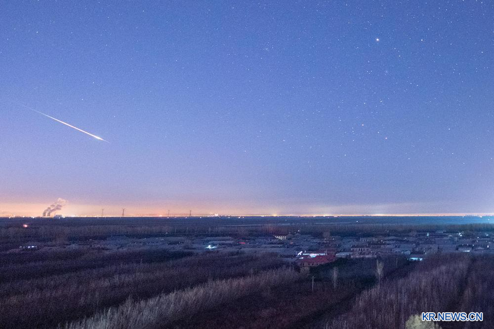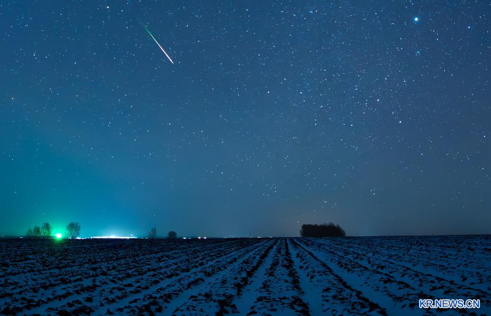 18일 새벽 헤이룽장(黑龍江)성 하얼빈(哈爾濱)시에 위치한 베이다황(北大荒)그룹 베이안(北安) 지사에서 촬영한 사자자리 유성우.