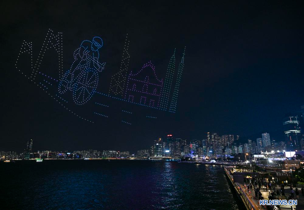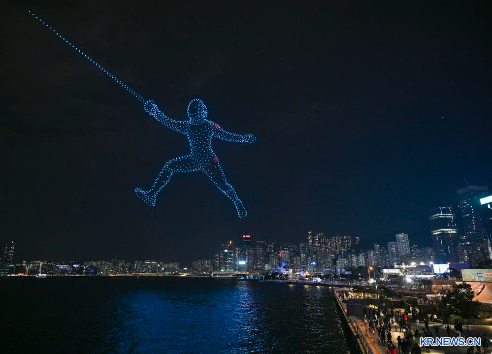 [신화망 홍콩 11월19일] '스포츠 파워 홍콩을 빛내다'를 주제로 한 대형 드론쇼가 18일 홍콩 빅토리아항에서 펼쳐졌다.