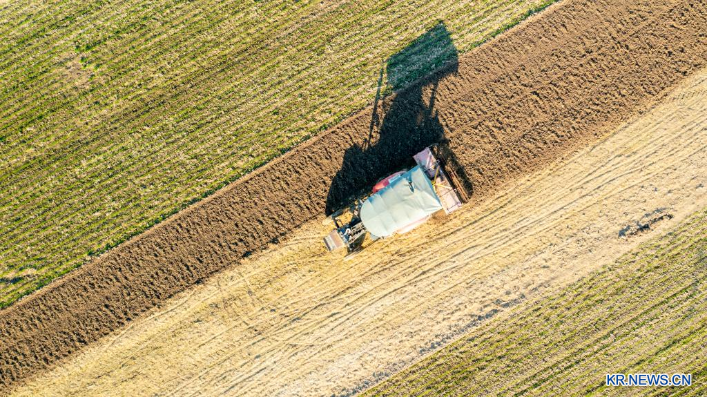 19일 허난성 상추(商丘)시 쑤이(睢)현 저우탕(周堂)진 치좡(齊莊)촌에서 농민이 밭에서 분주히 일하고 있다.