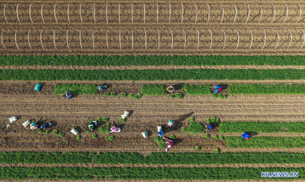 18일 허베이성 탕산시 훙차오진의 농민이 밭에서 고수를 수확하고 있다.