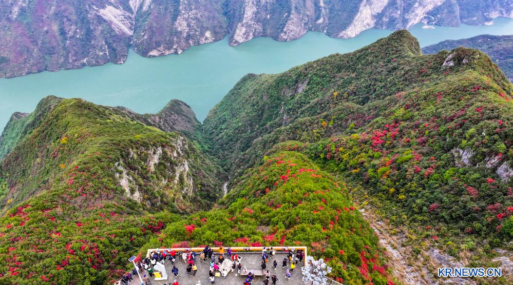 겨울이 되자 우산현 경내 창장(長江) 우샤(巫峽) 일대의 단풍이 빨갛게 물들어 장관을 이루고 있다. 우산현에는 8만㏊ 면적에 200종에 가까운 단풍이 있고 매년 11월부터 이듬해 1월까지 단풍을 감상할 수 있는 것으로 전해졌다. 2025.11.22