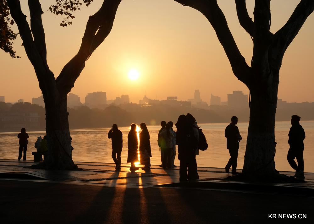 [신화망 항저우 11월24일] 최근 저장(浙江)성 항저우(杭州)시에 맑은 날씨가 이어지면서 아침햇살 속 시후(西湖)의 겨울 풍경을 감상하려는 관광객들의 발길이 이어지고 있다.