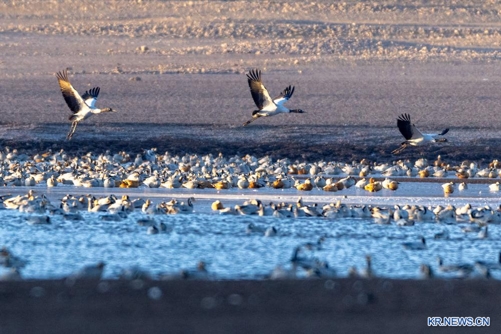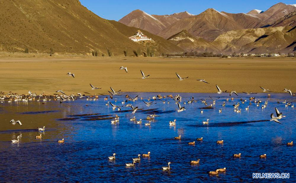 겨울이 오자 시짱(西藏)자치구 라싸(拉薩)시 린저우(林周)현에 월동 철새들이 모여들고 있다. 검은목두루미 등 철새들은 계곡, 호수 등지에 모여 먹이를 찾거나 휴식을 취하고 있다.