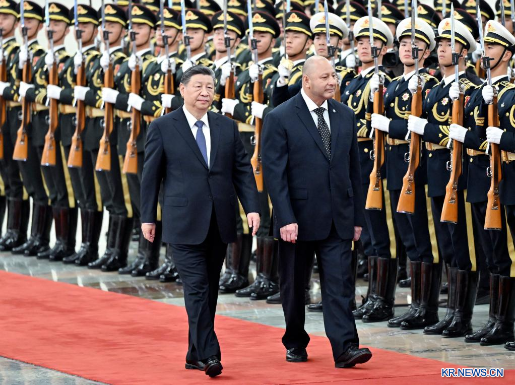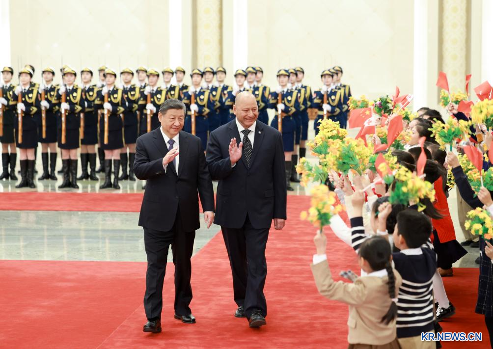 시진핑(習近平) 중국 국가주석이 25일 오전 베이징 인민대회당에서 중국을 국빈 방문한 투포우 6세 통가 국왕과 회견했다. 회담에 앞서 시 주석은 인민대회당 북대청에서 투포우 6세 국왕을 위해 환영식을 마련했다.[촬영/신화사 기자 딩하이타오(丁海涛)]