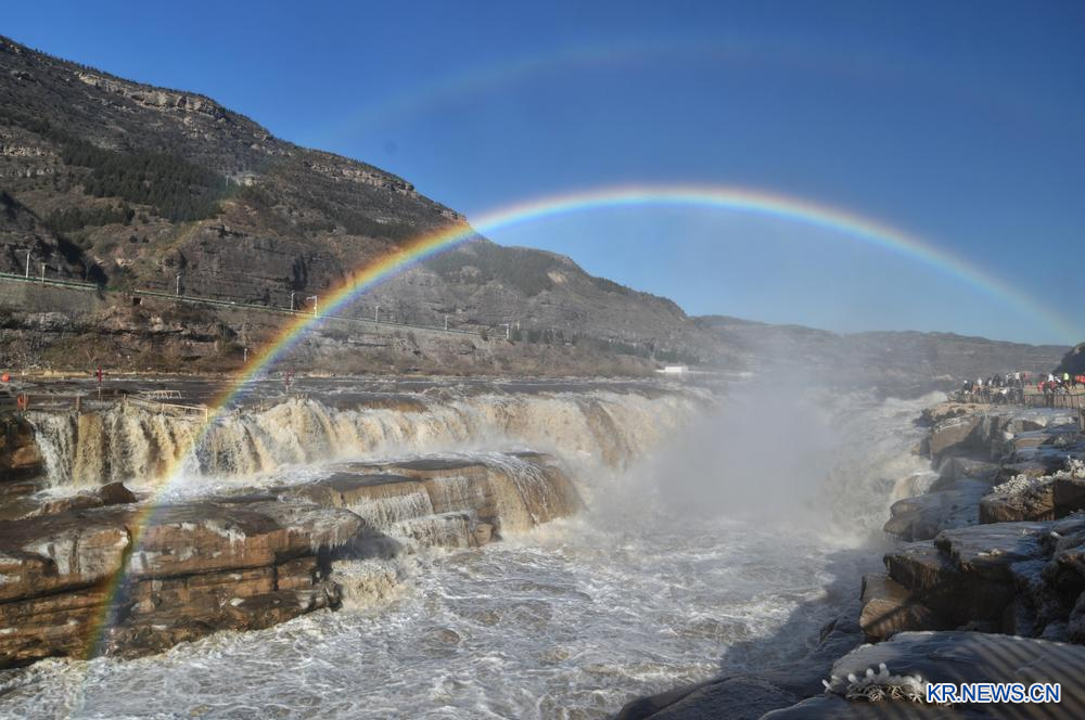 상류 저수지의 방류 작업으로 산시성 지현과 산시(陝西)성 이촨(宜川)현의 경계에 있는 황허 후커우 폭포에 수량이 증가했다. 물안개와 햇빛이 만나 생겨난 '쌍무지개'가 많은 관광객을 매료시켰다. 2025.12.3
