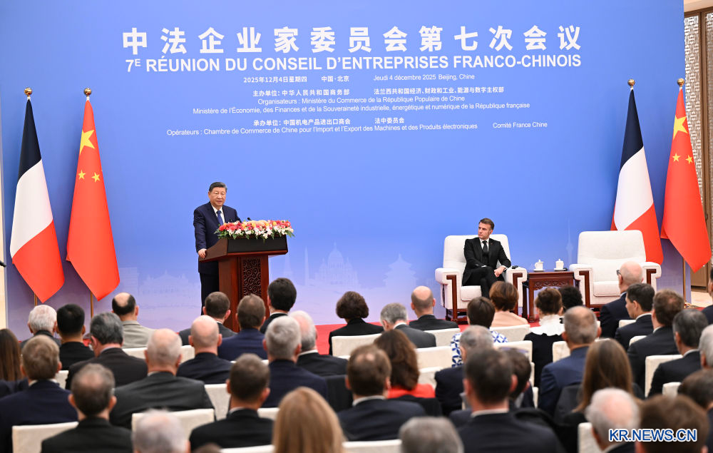 [신화망 베이징 12월4일] 시진핑(習近平) 중국 국가주석이 4일 베이징에서 에마뉘엘 마크롱 프랑스 대통령과 제7차 중국-프랑스 기업가위원회 회의 폐막식에 참석하고 축사를 했다.