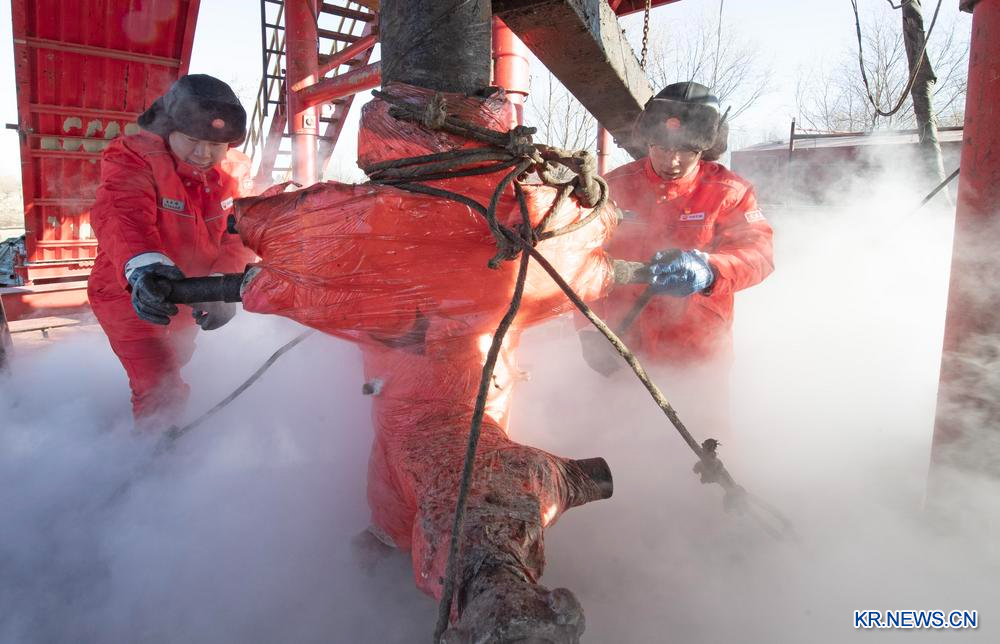 헤이룽장(黑龍江)성 다칭(大慶)유전 직원들이 11일 한파 속에서 유정 보수 작업을 하고 있다.