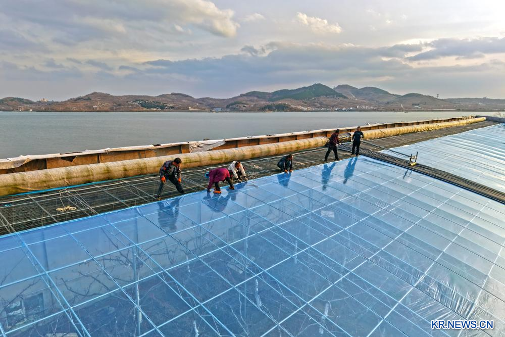 11일 산둥(山東)성 옌타이(煙台)시 푸산(福山)구 체리 비닐하우스 필름을 교체하고 있는 농민들. 2025.12.11