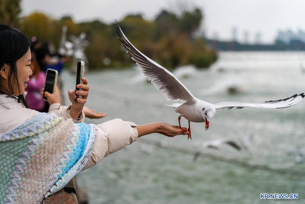 11일 여행객이 윈난(雲南)성 뎬츠(滇池) 인근 하이겅둥(海埂東)부두에서 붉은부리갈매기에게 먹이를 주고 있다.