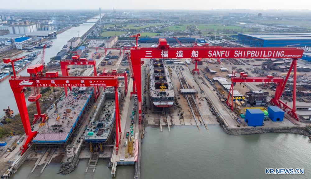 12일 여러 척의 대형 선박을 건조 중인 장쑤(江蘇)성 타이저우(泰州)시 가오강(高港)구에 위치한 타이저우 싼푸(三福)선박공정회사 생산기지를 드론으로 내려다봤다. 2025.12.12