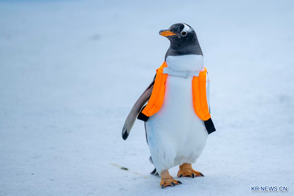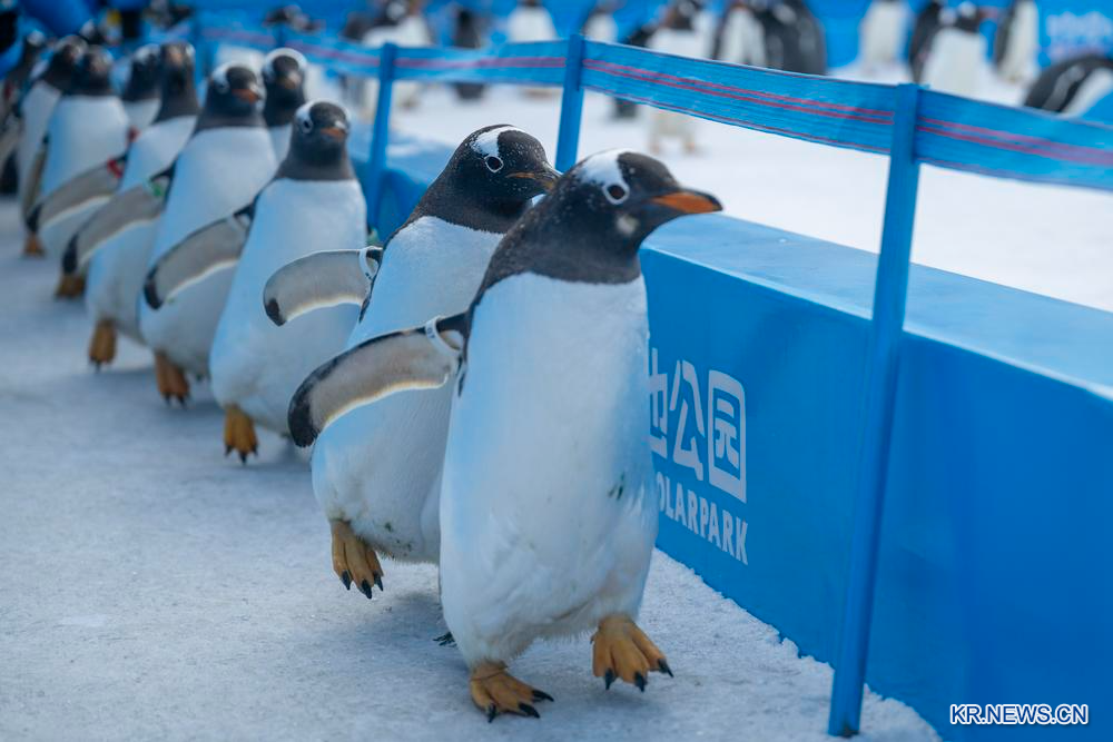 13일 헤이룽장(黑龍江)성 하얼빈(哈爾濱) 극지공원 펭귄이 야외에서 퍼레이드를 하고 있다.