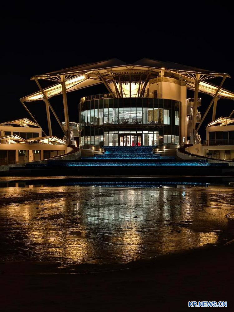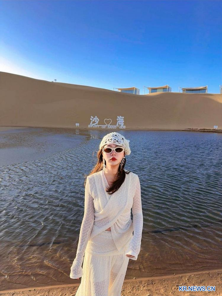 [신화망 인촨 12월14일] 겨울의 텅거리(騰格里)사막, 차가운 바람이 모래 언덕을 스치고 지나간다. 후베이(湖北) 우한(武漢)에서 온 여행 패션 블로거 쩌우멍제(鄒夢婕)는 흰색 롱드레스를 입고 저녁 햇살에 반짝이는 사막 호수를 배경으로 수많은 사진을 남겼다.