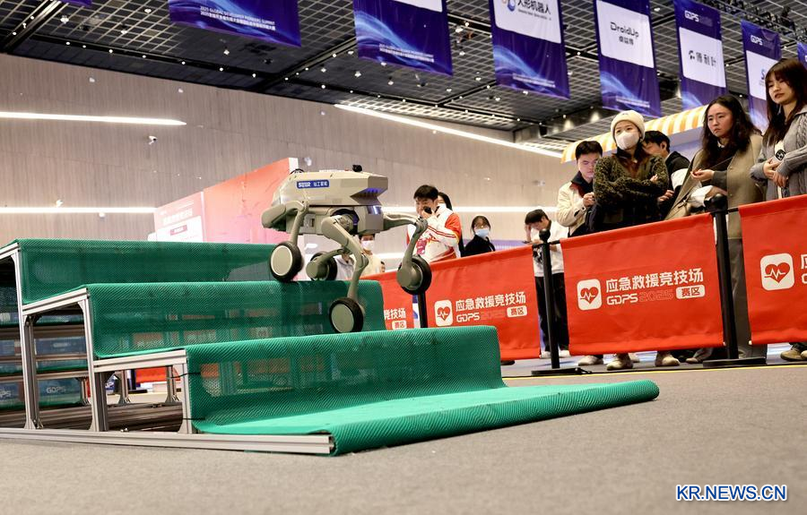 '2025 글로벌 개발자 컨퍼런스 및 국제 체화지능 기능 대회(GDPS 2025)'에서 바퀴형 로봇이 응급구조 경기장에서 계단 오르기 기술을 시연하고 있다. (사진/신화통신)